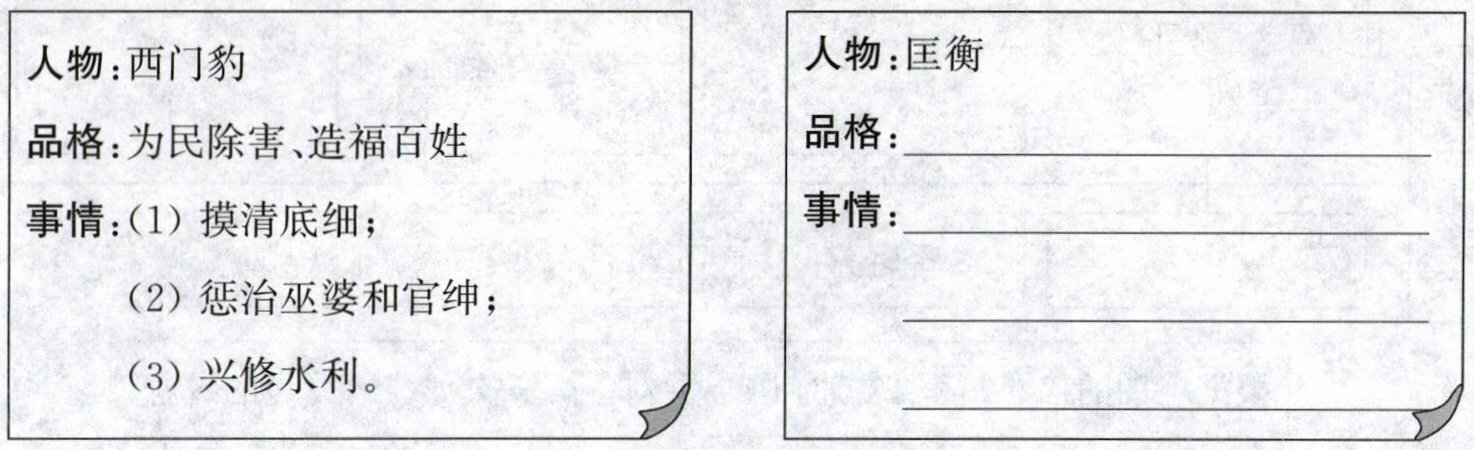 5. 为了讲好历史人物西门豹的故事,小涛做了一张小卡片,把故事里的重要信息都写在了上面。请你照样子,为匡衡的故事做一张小卡片。(4 分)