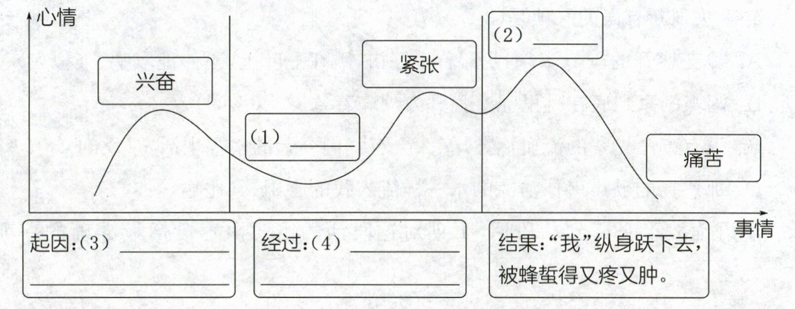 答案:1. (1)犹豫 (2)庆幸 (3)“我”对蜂巢的建造充满好奇,决定独自去看蜂巢 (4)“我”鼓起勇气爬向蜂巢,仔细观察蜂巢的建造过程