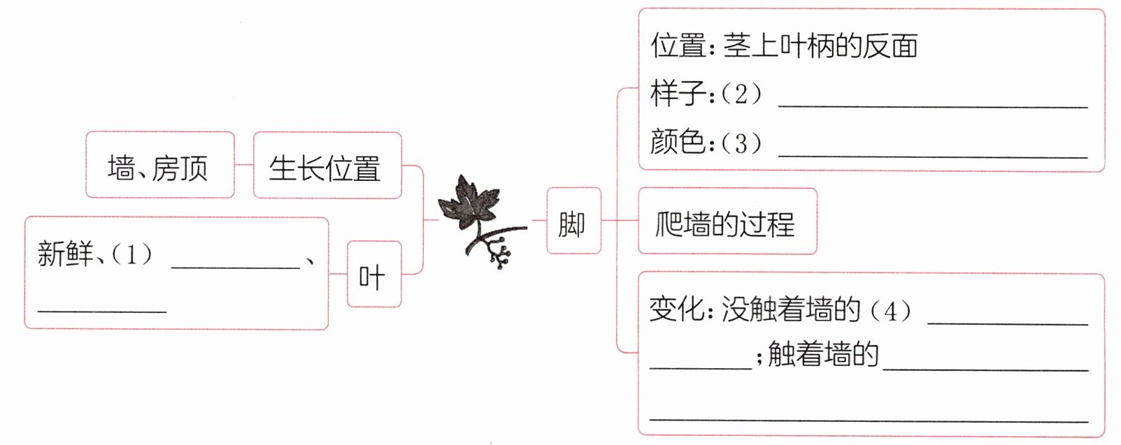 五、作者是从哪些角度来写爬山虎的?将下面的框架图补充完整。