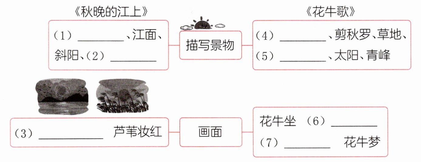 (1)归鸟 (2)芦苇 (3)倦鸟归巢 (4)花牛 (5)白云 (6)花牛眠 (7)花牛走