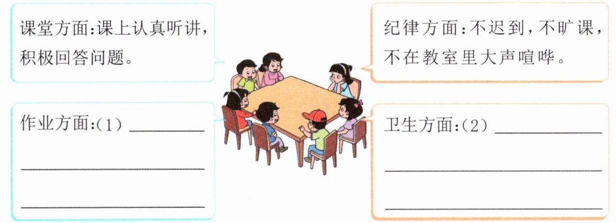 四、班会上,同学们针对班级公约展开讨论。请你参与到讨论中,就作业和卫生方面给他们提点建议,一起为班级的美好未来添砖加瓦。