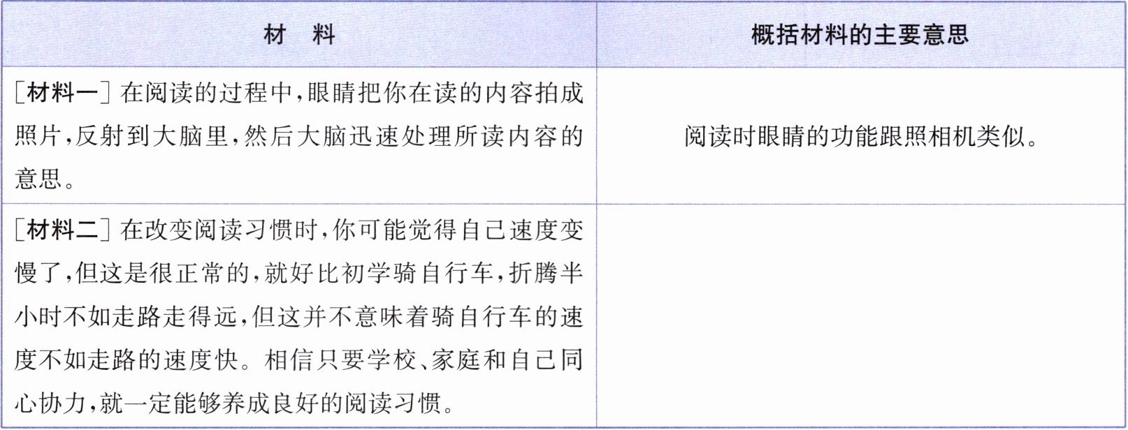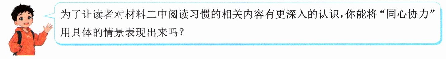 为了让读者对材料二中阅读习惯的相关内容有更深入的认识,你能将“同心协力”用具体的情景表现出来吗?