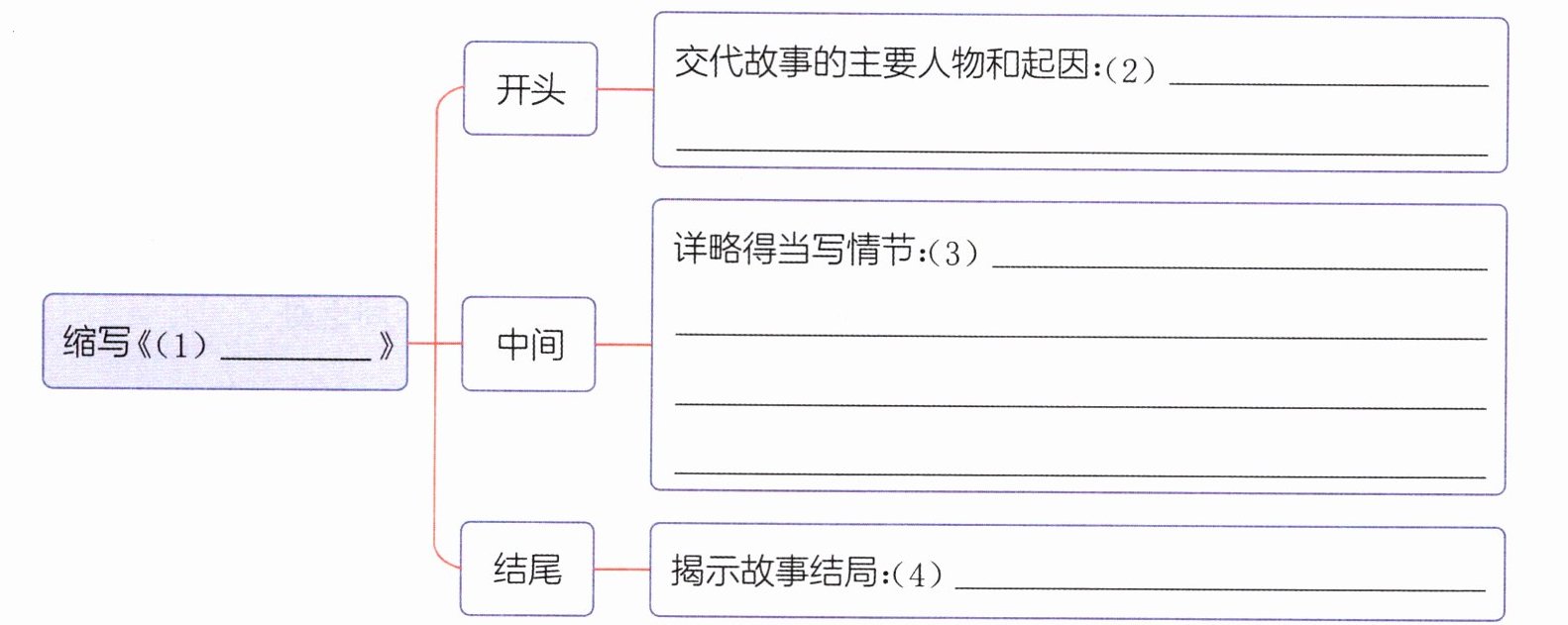 )答案:示例:(1)猎人海力布 (2)猎人海力布救了小白蛇,被小白蛇带回了家。 (3)海力布要了一颗能使人听懂动物说话的宝石。海力布临走时,小白蛇叮嘱他,无论动物说了什么话,都不要对别人说,否则他就会变成石头,永远不能复活。一天,海力布正在深山里打猎,忽然听到鸟的议论,知道即将发生灾难,他为了救乡亲们,说出了秘密。 (4)海力布变成了石头,乡亲们很难过。