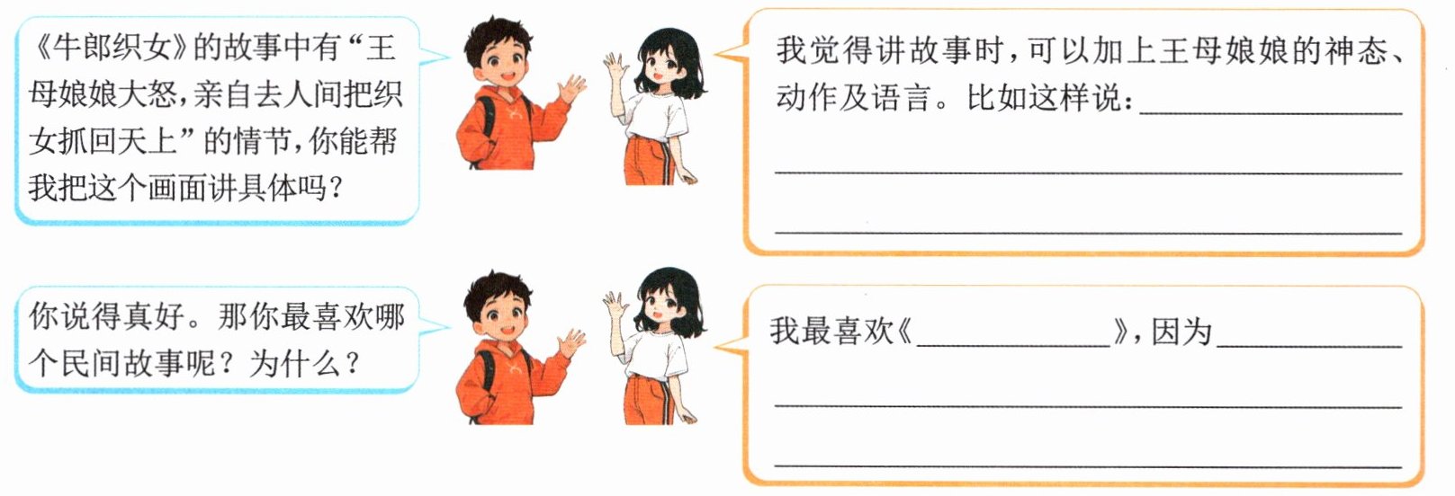三、班级要举行“讲民间故事”活动,小语准备讲《牛郎织女》的故事。请你结合情境,完成小语和小文的对话。