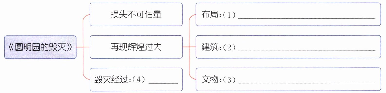 三、小语听着导游的解说,想起了自己学过的知识,他结合课文,用下面的思维导图为同行的小文又解说了一遍圆明园的历史变迁。
