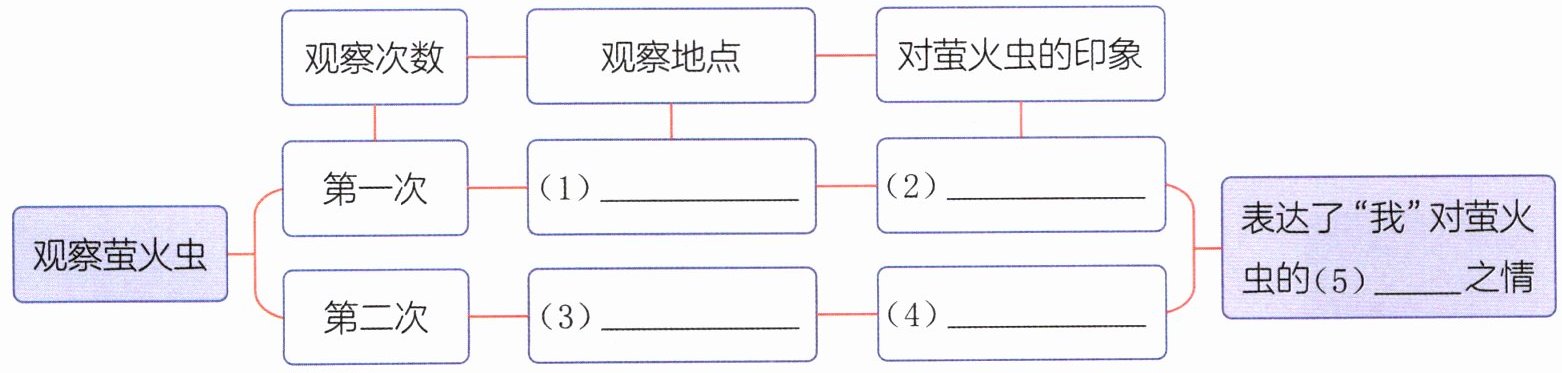 1.(阅读要素)讲解员说得真精彩,他向我们分享了他两次近距离观察萤火虫的经历,请你将相关信息填写在下面的思维导图中。