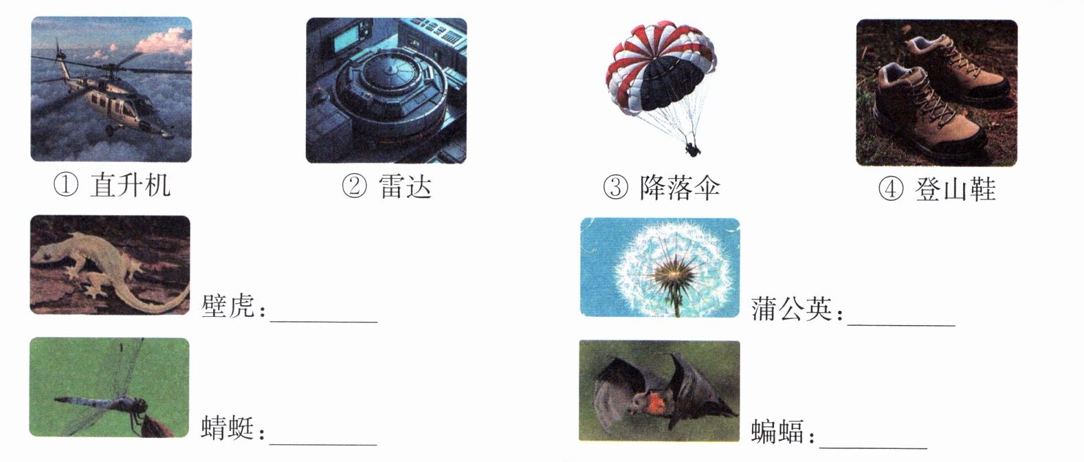 6. ④ ③ ① ② 解析:壁虎足趾腹面的皮肤褶皱形成吸盘,使其能在垂直的墙壁上行动自如,仿生学家由此受到启发,设计出能在陡峭的山地上行走的登山鞋。蒲公英的冠毛有适应风力传播果实的作用,仿生学家根据蒲公英的这种特性,设计出降落伞。蜻蜓的翅膀结构使其在空中能够快速地飞行和悬停,人们由此得到启发设计出直升机。蝙蝠是一种哺乳动物,具有回声定位能力,可以在黑暗中探测和定位障碍物。仿生学家根据蝙蝠的这种特性,发明了雷达。
