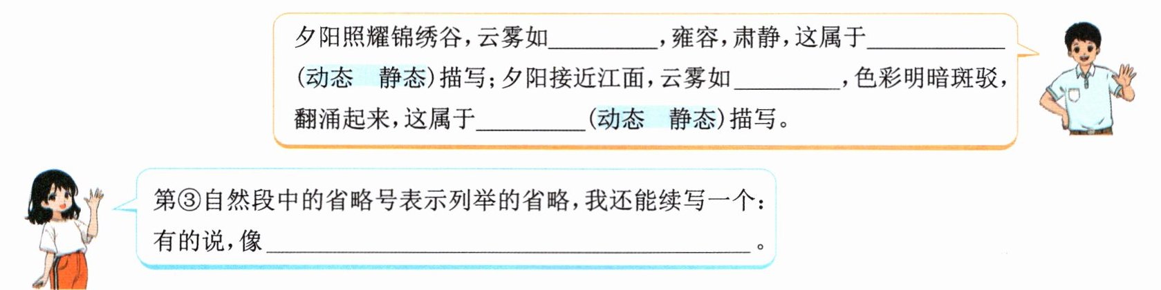 (动态 静态)描写。第③自然段中的省略号表示列举的省略,我还能续写一个:有的说,像