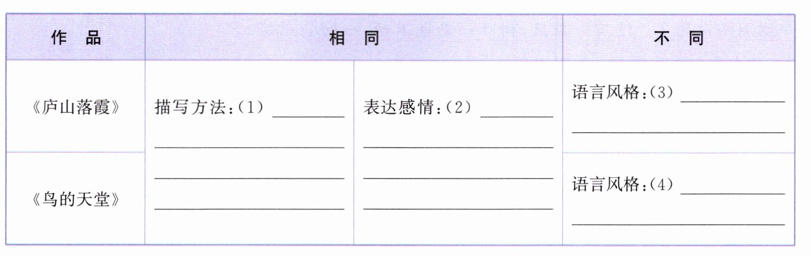 4. (对比阅读)比较本文和课文《鸟的天堂》,二者在描写景物的时候有什么相同和不同之处? 完成表格。