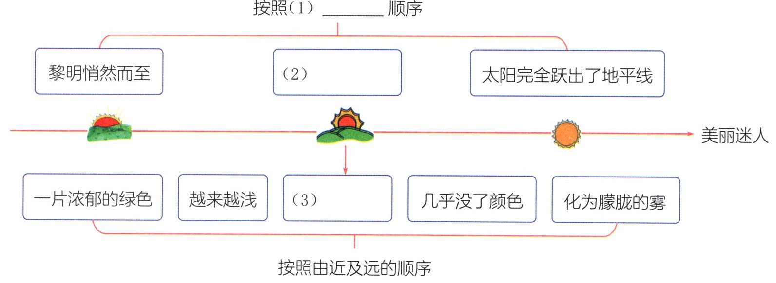答案:1. ② 2. 静态 示例:通过描写没有风,树叶静止不动,营造了一种安静祥和的氛围。同时,玻璃一样平滑的河面上泛着幽白的雾,给人一种梦幻的感觉。整个场景让人感到无比宁静、舒适和愉悦。 3.(1)时间(2)天更亮了 (3)淡成春天娇柔的嫩绿