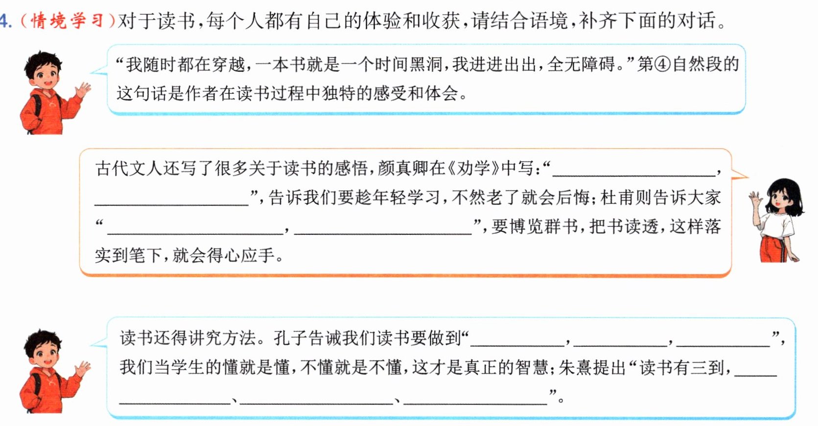 4. (情境学习)对于读书,每个人都有自己的体验和收获,请结合语境,补齐下面的对话。