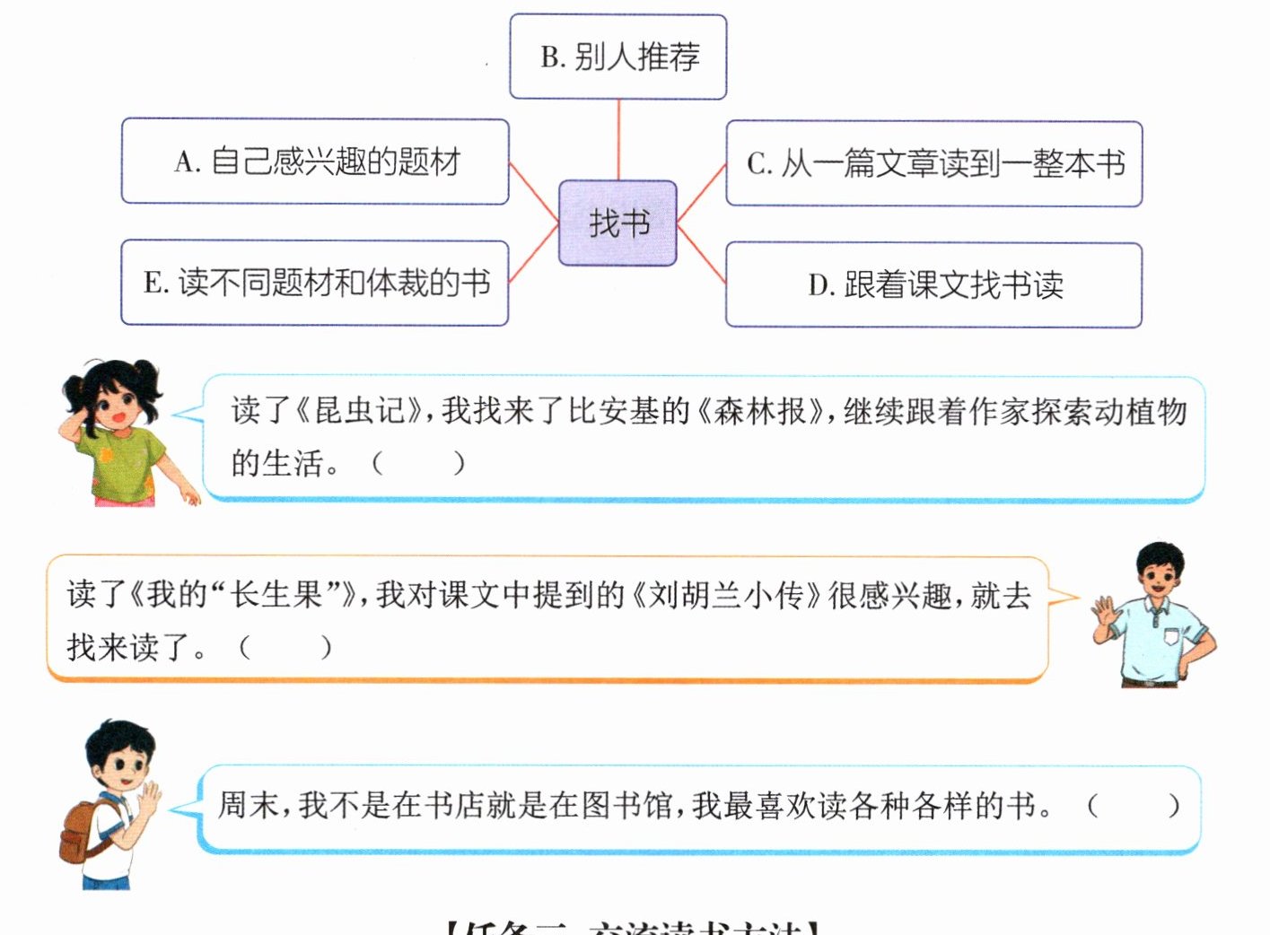 二、同学们交流分享了自己找书读的方法,请结合本单元学习到的“择书”方法,完成对话。(填字母)