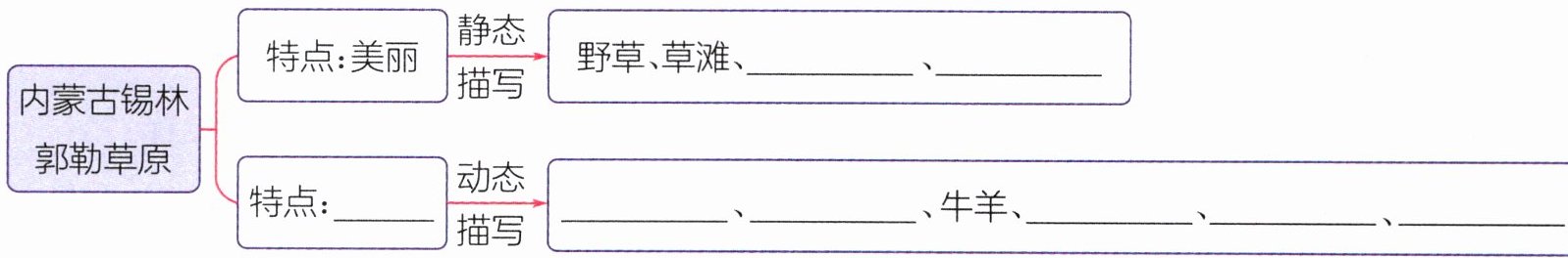 ”。答案:1. ① ② 情景交融 既写出了草原的景色美,又表达了作者对草原美景的热爱之情,情与景浑然一体 2. 湖水 野花 欢腾 雄鹰 百灵鸟 马 黄羊 牧民 3. 示例:慢骑交谈 策马追逐 欢笑歌唱 快乐 4. 空间 草原 喜爱和赞美 示例:天苍苍,野茫茫,风吹草低见牛羊