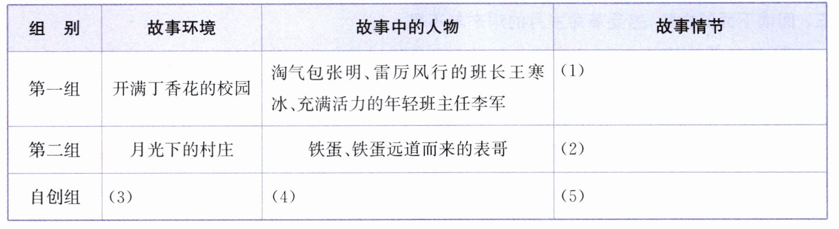 答案:示例:(1)张明摘了丁香花,班长王寒冰告诉了班主任李军 (2)他们互相诉说着分别后发生的有趣的事情 (3)夕阳西下的码头 (4)姐姐芳芳、妹妹婷婷 (5)姐妹俩依依不舍地告别