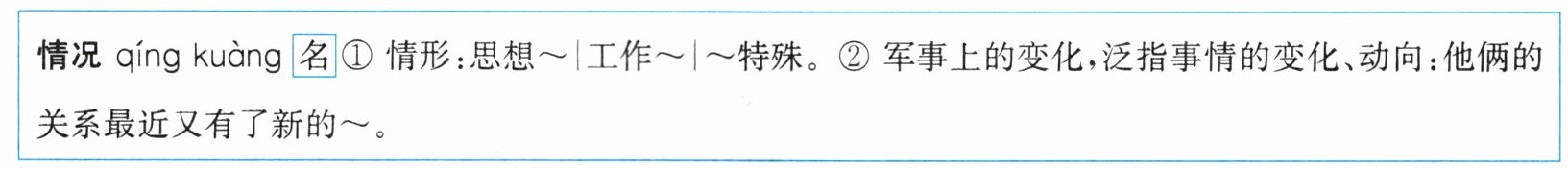 3.(1)① (2)② 解析:(1)本句中的“情况”指事情发展的情形,因此选①。(2)结合“前线”可知,本句中的“情况”指的是战场(军事)上的变化,泛指事情的变化、动向,因此选②。