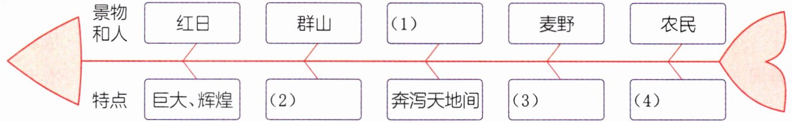 答案:1.(1)河流 (2)鲜丽 (3)欢乐无羁、莽莽 (4)认真耕作、喜悦 示例:群山 群山在日出之际梦幻般闪耀着千万种色彩,美极了 2. 劳动者 美丽和富饶 劳动 劳动者 3. 示例:表达出土地对农民十分重要,带给农民无限希望