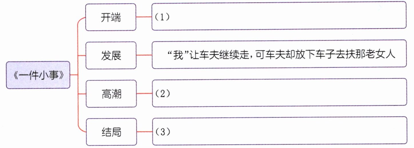 答案:1.(1)“我”雇了一辆人力车去S门,有一个老女人被车把带倒了 (2)车夫放弃了生意去帮助她,这种行为既让“我”自省,也让“我”心生敬佩 (3)车夫被留在巡警分驻所,“我”请巡警转交给车夫一大把铜圆后离开,这件事给“我”留下了难以磨灭的印象