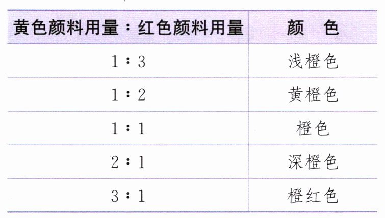 (1)(学科融合)将黄色颜料和红色颜料按不同的比混合可以调出不同颜色,如果奇奇用颜料调色时,黄色颜料用量占颜料总用量的$\frac{1}{4}$,那么按照下表奇奇调出的颜色是(