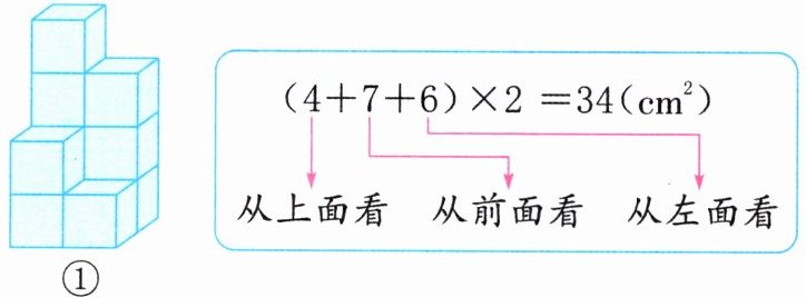 5. 下面两个物体都是由棱长为1cm的小正方体搭成的。物体①的表面积可以按其右边框中的方法计算。物体②的表面积是(