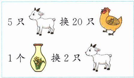 (1)(人文历史)原始社会的人们采用“以物易物(等价交换)”的形式促进物品流通。如果规定的交换规则如下图所示,1 个