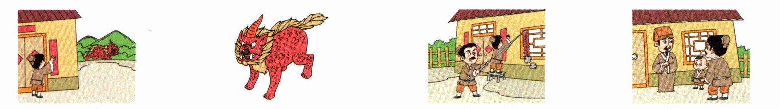 One day, an old man came to the village. He told the people something about Nian. Soon it was the last day of the year. Nian came down from the hills. He saw red paper on the doors and windows. He also saw red firecrackers. He felt afraid and ran back into the hills.