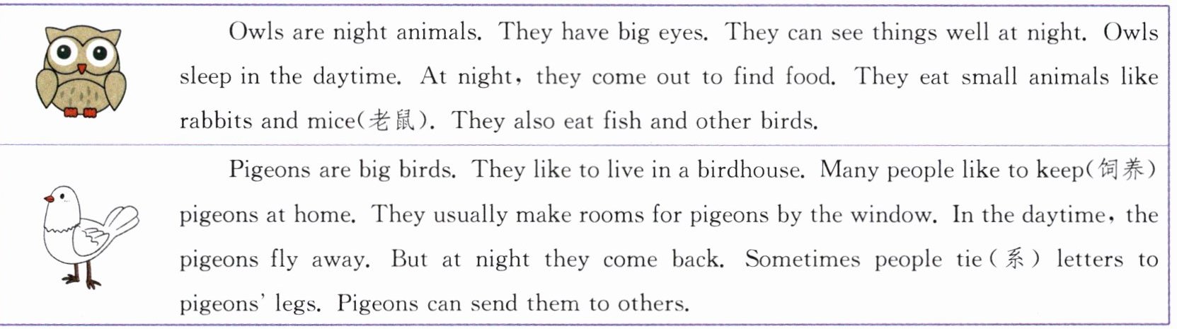 ||Owls are night animals. They have big eyes. They can see things well at night. Owls sleep in the daytime. At night, they come out to find food. They eat small animals like rabbits and mice(老鼠). They also eat fish and other birds.|