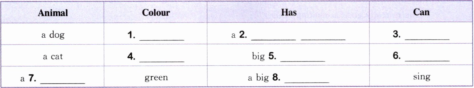 答案:1.brown 2.short tail 3.run 4.orange 5.ears 6.jump 7.parrot 8.mouth