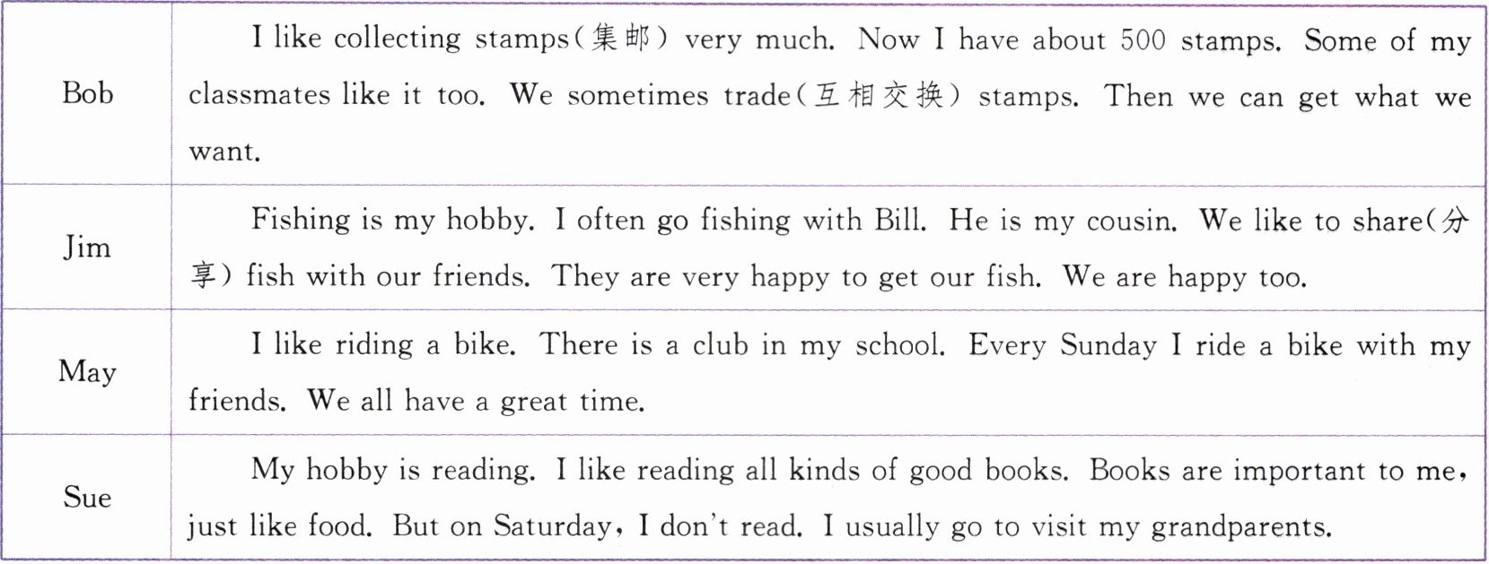 3. C 解析:根据表格第三栏中“Every Sunday I ride a bike with my friends.”可知,May 每周日和她的朋友们骑自行车。