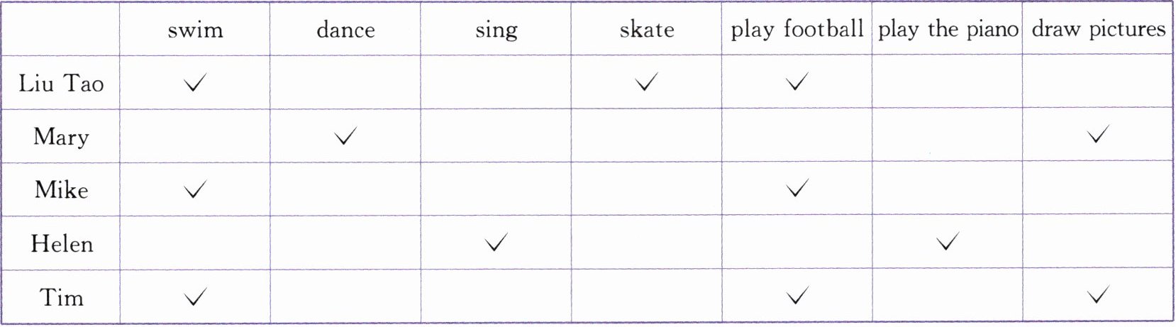 答案:1. Yes,they do. 2. He can play football. 3. No,she can't. 4. She likes dancing and drawing pictures.