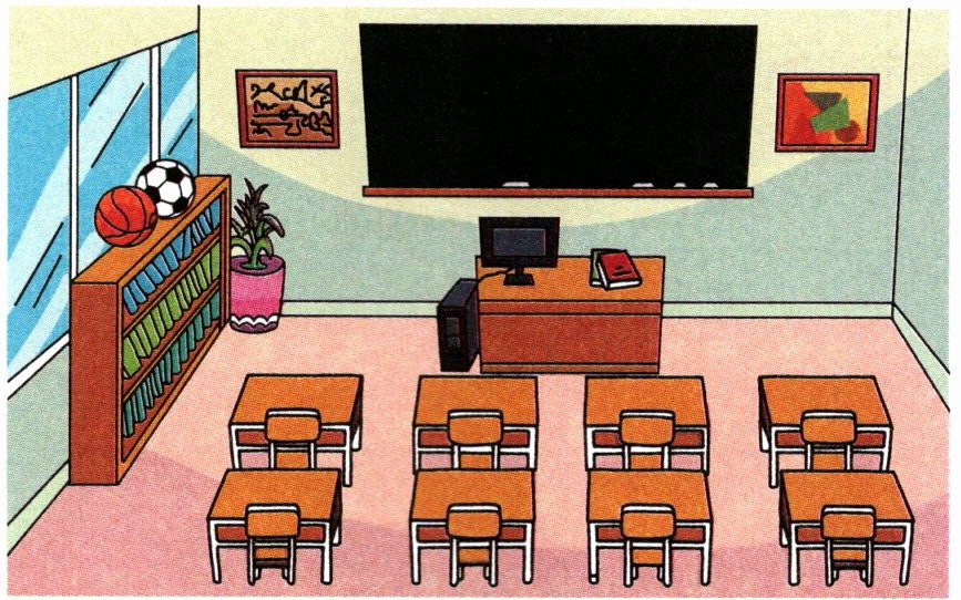 五、安迪正在带他的朋友参观教室。请你根据教室图补全他们的对话。
