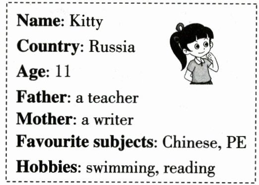 答案:One possible version: I want to make friends with Kitty. She is from Russia. She's 11 years old. Her father is a teacher. Her mother is a writer. Kitty likes Chinese and PE best. She likes swimming and reading.
