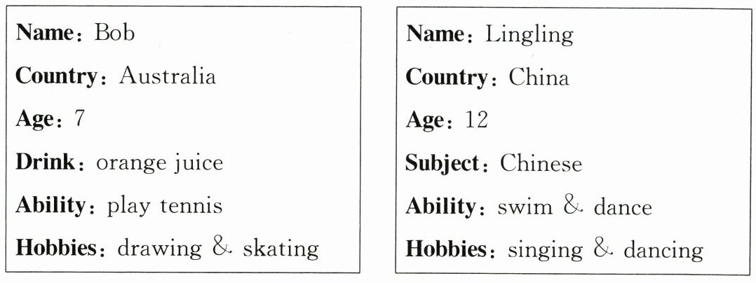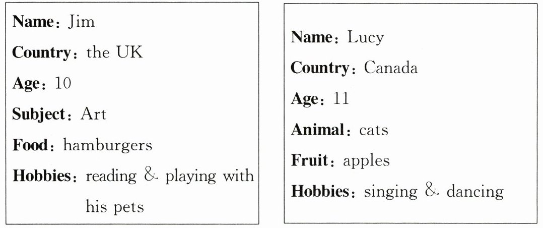 .答案:1. e-friends 2. Saturday;Sunday 3. sending an email 4. Lucy/Lingling;Lingling/Lucy 5. Lucy;she likes singing and dancing(本小题答案不唯一)