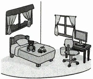 One possible version: My bedroom Look at the picture. This is my bedroom. My bedroom isn't big, but it's very beautiful. There are two windows in the walls. There's a small bed in the room. There are two toys on the bed. There's a desk near one of the windows. On the desk, there is a computer. I like my bedroom.