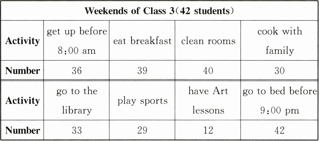 . Sports can make them healthy.答案:forty-two/42;get;Three/3;clean;cook;library;Art;sports
