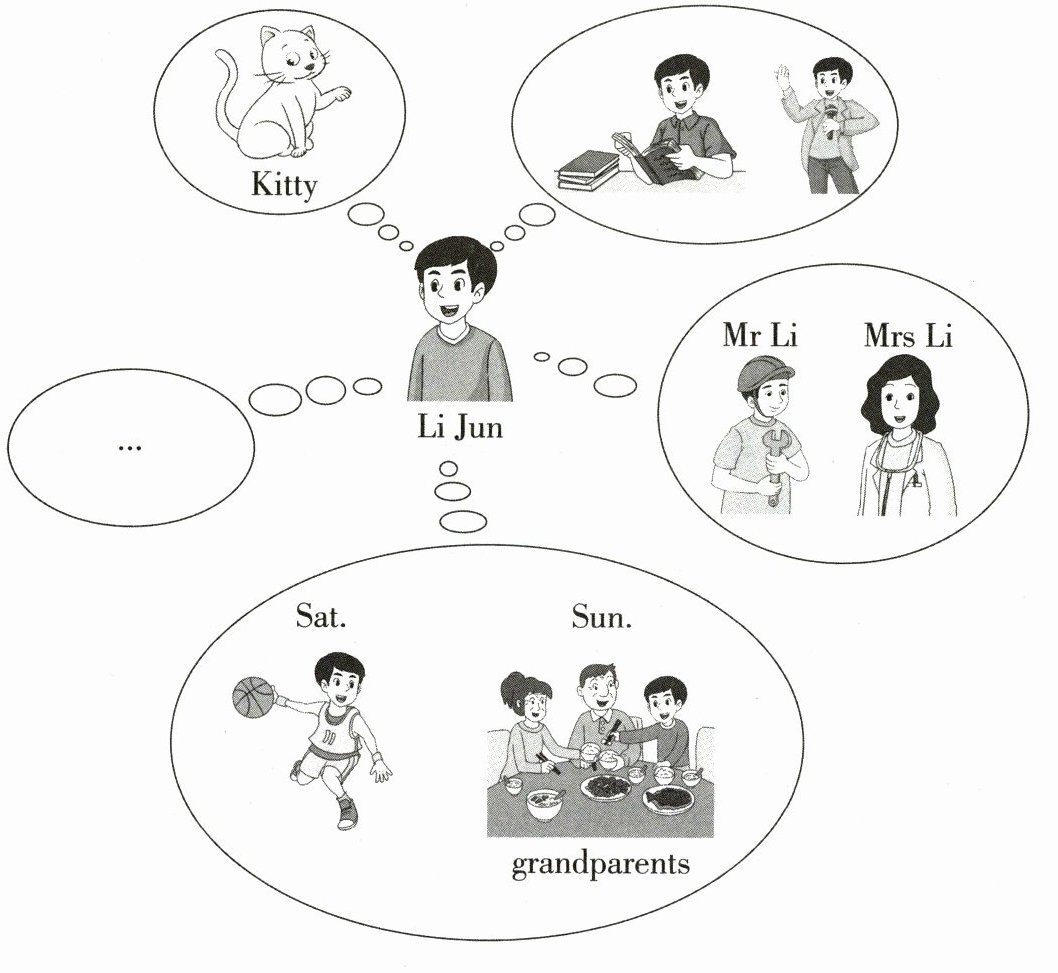 He is 11 years old. There are five people in his family:his parents,his grandparents and him. His father is a worker and his mother is a doctor. His grandparents are farmers. Li Jun likes reading books. He is good at singing. He often plays basketball on Saturday and has a big dinner with his grandparents on Sunday. He has a cat,Kitty. He often plays with it after school. What about your new classmate?