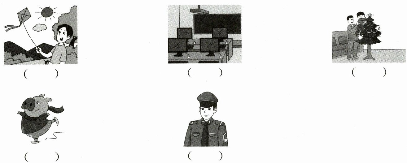 听录音,根据所听顺序用阿拉伯数字给下列图片编号,并将答案填写在图下的括号内。