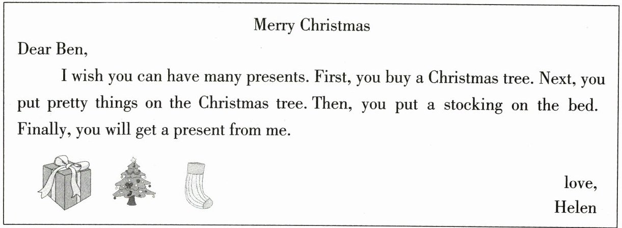 pretty things on the Christmas tree.3. After putting a stocking on the bed,Ben will get a