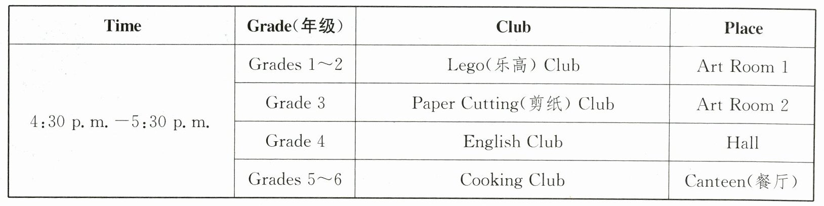 )4. Linda wants to cook nice food. She can go to the ______.A. Lego Club B. Cooking Club C. Paper Cutting Club