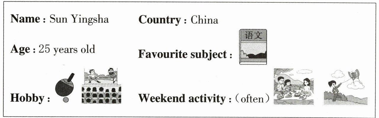 答案:One possible version:Sun Yingsha is a sports star. I often watch her games on the Internet. I like her very much. She is from China. She is 25 years old. Her favourite subject is Chinese. She likes playing table tennis and watching films. She can play table tennis very well. At weekends,she often has a picnic and flies a kite. She is a great player. Do you know her?