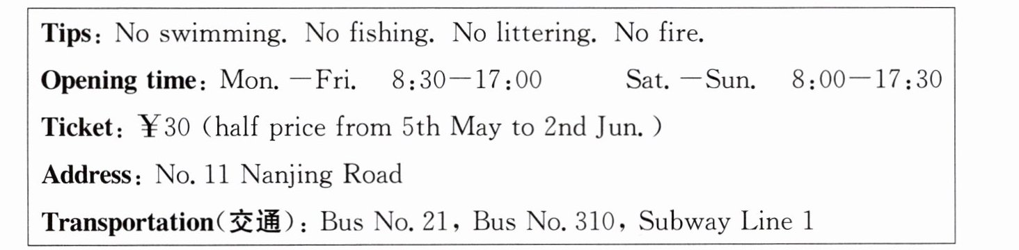 答案:1. There is a small village. 2. Some ducks and boats. 3. They can read books. 4. They can't swim,fish,litter or play with fire. 5. Thirty yuan.