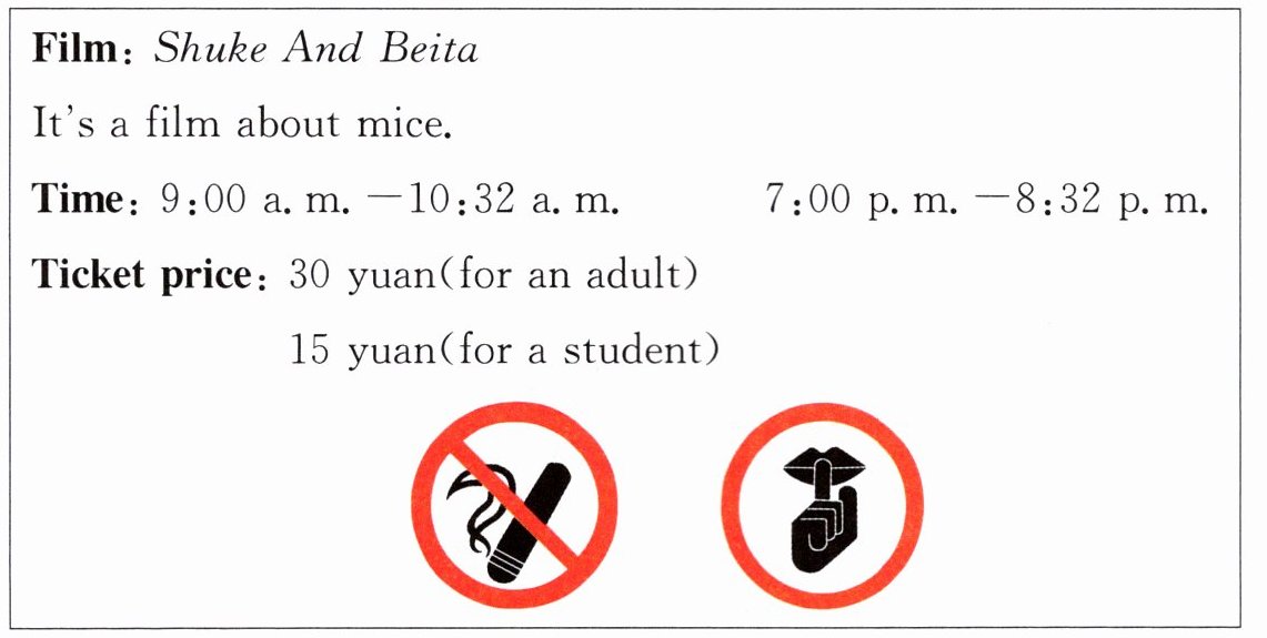 ) 5. Betty is a student. She wants to see the film with her parents. They are going to pay 65 yuan.答案:1. T 2. T 3. F 4. T 5. F 解析:由材料内容可知,成人票价为30元,学生票价为15元,Betty和父母共花费30+30+15=75元。