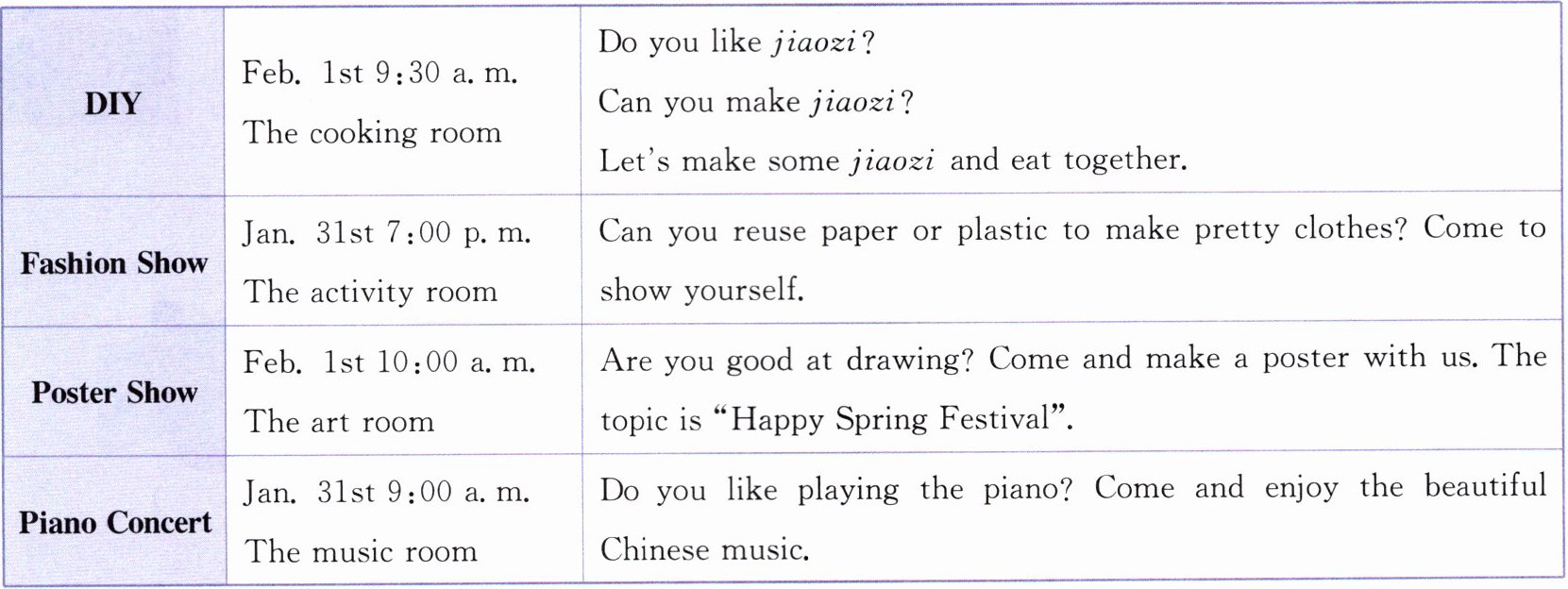 room when she is free(空闲的).答案:1. 9:00 a.m. 2. reuse 3. drawing 4. jiaozi 5. activity