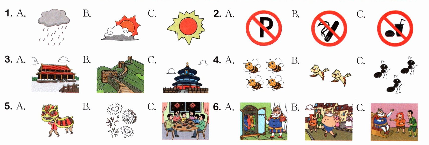 二、(苏州姑苏区)听下面6个句子,从题中所给的A、B、C三个选项中圈出与所听句子匹配的图片。