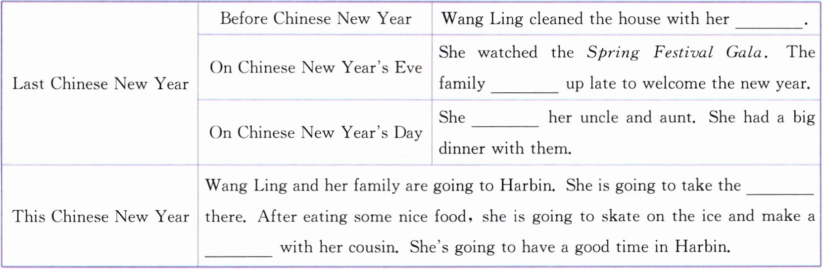 答案:(mother;stayed;visited;train;snowman)