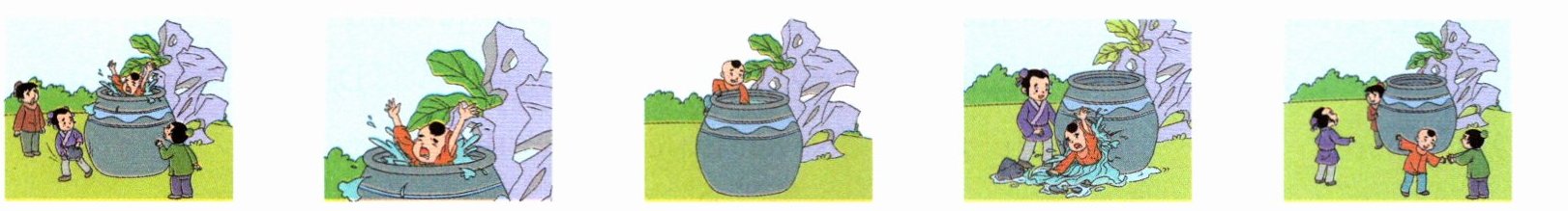 A boy wants to climb up the large vat. Suddenly he slips(滑倒) and falls into the vat. He is afraid and shouts. Then Sima Guang has an idea. He picks up a large stone and breaks the vat with it. The water flows out. The boy is saved.