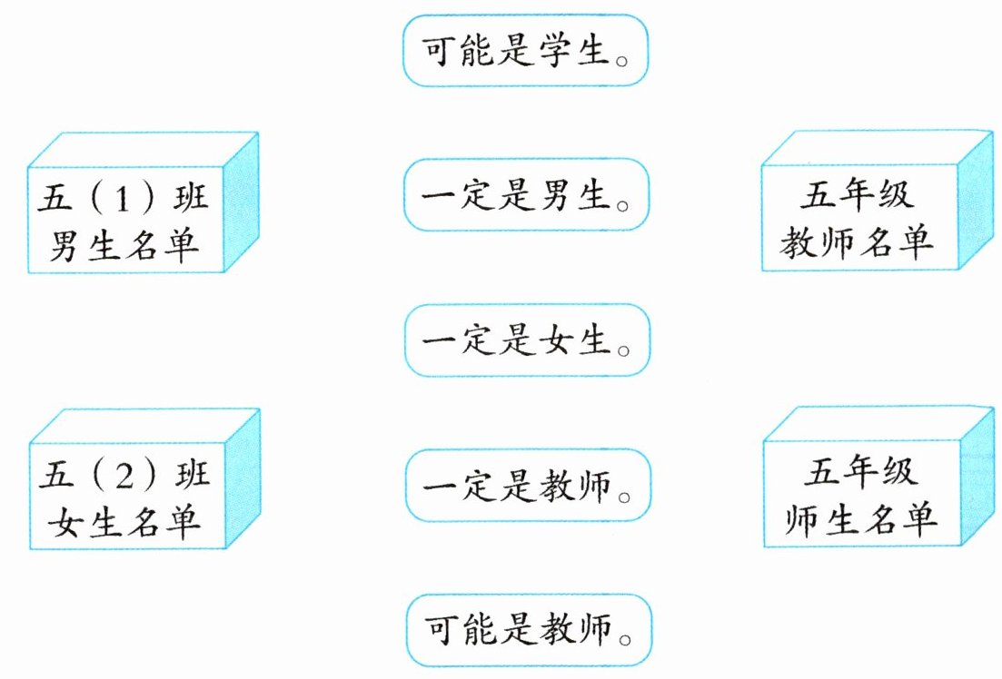 答案:从左到右,从上到下依次为:可能是学生----五年级师生名单;一定是男生----五(1)班男生名单;一定是教师----五年级教师名单;一定是女生----五(2)班女生名单;可能是教师----五年级师生名单。