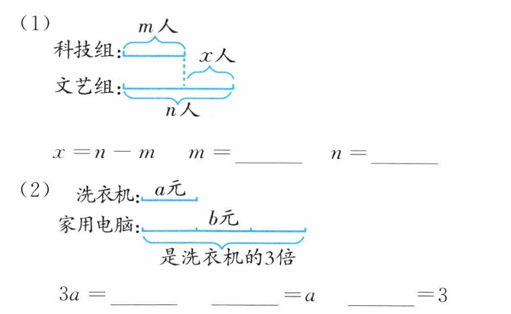故答案依次为:(1)$n - x$;$m + x$;(2)$a + b$;$\frac{a + b}{3}$;$\frac{a + b}{a}$。