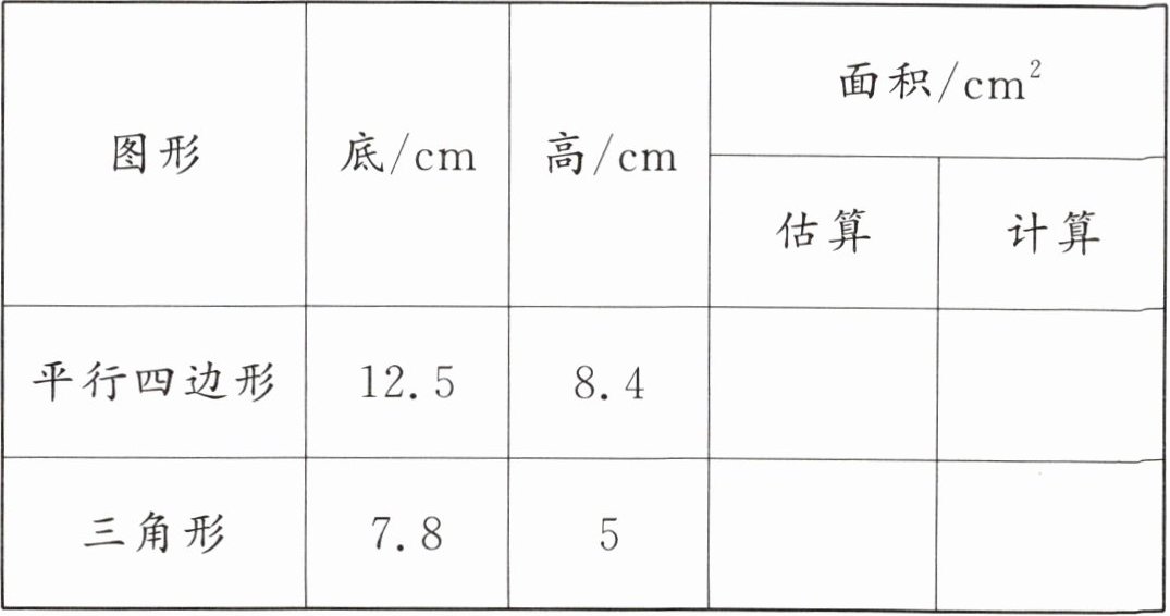 |图形|底/cm|高/cm|面积$/cm^2$|