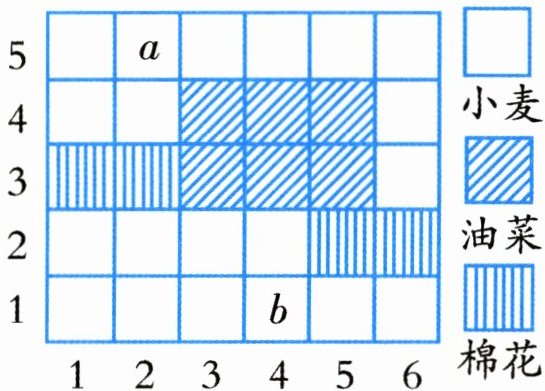 根据数对表示位置的方法,第一个数表示列,第二个数表示行。已知(1,3)处种植棉花,对应图中第1列第3行的竖线阴影区域,即棉花是竖线阴影。图中斜线阴影区域在第3-5列第3-4行,(3,4)在该区域,所以种植油菜;第5-6列第2行是竖线阴影,(6,5)在第6列第5行空白区域,(5,2)在第5列第2行竖线阴影区域,所以种植棉花;a号小麦区在第2列第5行,即(2,5);b号小麦区在第4列第1行,即(4,1)。