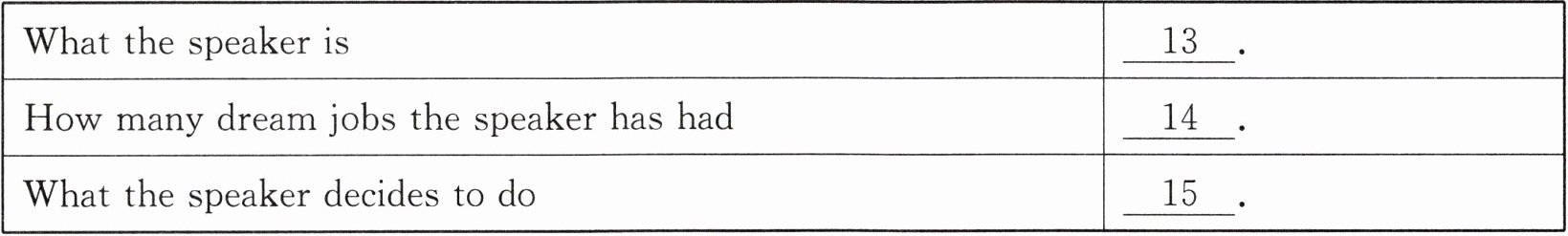 听第一篇短文,回答第 13 - 15 小题。请根据短文内容,选择正确答案,完成信息记录表。答题完毕,请等待“嘀”的信号,进入下一篇短文。